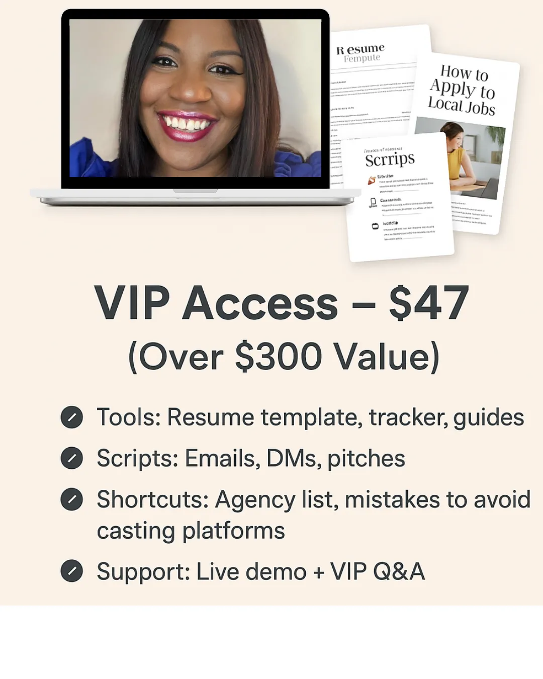 Why waste weeks trying to figure it all out yourself? With the VIP Upgrade, you’ll skip the DIY overwhelm and get my exact plug-and-play system — everything from your resume to agency contacts to real application scripts. I’ve done the heavy lifting so you can focus on landing your first paid gig faster, with clarity and confidence.